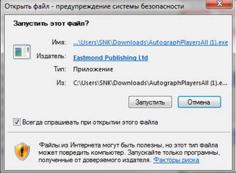 2. Запустите файл инсталлятора AutographPlayersAll.exe. Откроется окно предупреждения системы безопасности. В этом окне нажмите кнопку Запустить.