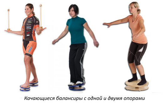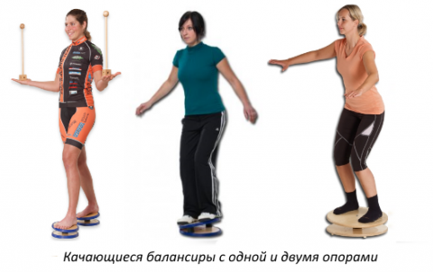 - Качающиеся балансиры с одной и двумя опорами, качающиеся и подвижные опоры для ног, качающиеся тренажеры позволяют выполнять упражнения для стабилизации осей ног, мобилизации голеностопных сочленений, координации движений, чувства равновесия и повышения скорости реакции. Способствуют улучшению взаимодействия между нервной системой и двигательной мускулатурой. Можно тренироваться, стоя как на обеих, так и на одной ноге.