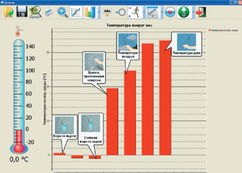 • Для просмотра показаний какого-либо датчика во время эксперимента также требуется только одно нажатие кнопки — той, на которой изображен понятный и легко запоминающийся символ этого датчика.
