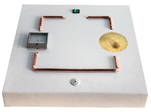 Экспонат демонстрирует явления электромагнитной индукции, возникающей при прохождении магнита в зазоре между двумя электрическими катушками.