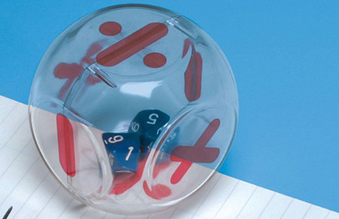 В прозрачной пластиковой кости на грани которой нанесены символы (+, –, ×, ÷), находятся две малые десятигранные кости с цифрами от 0 до 9. Нужно выполнить действие в соответствии с выпавшими знаками и цифрами на большой и малых костях.