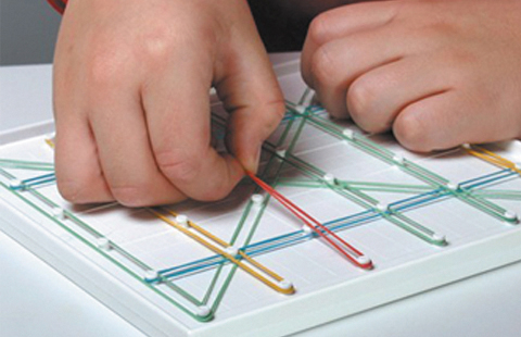 Изображая с помощью резиночек геометрические фигуры на геоборде, ребенок осваивает координаты на плоскости. Игровое поле геоборда — пластиковый планшет с выступающими колышками, расположенными с одинаковыми промежутками по горизонтали и вертикали, за которые можно цеплять резинки и «рисовать» геометрические фигуры.