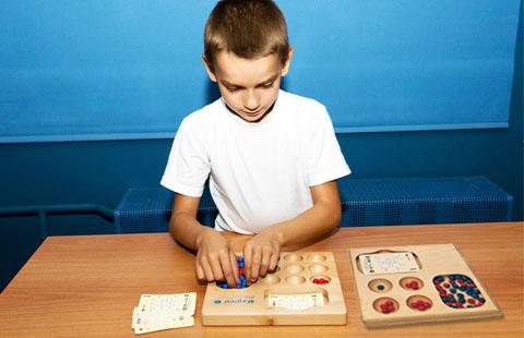 В игровой форме прорабатывается сложение и вычитание, формируется логическое мышление. На карточках с игровыми заданиями проставлены некоторые числа, которые определяют сумму чисел, расположенных на соответствующей горизонтали, вертикали или диагонали. Эту сумму надо получить, помещая в углубления деревянного игрового поля шарики с красными единичками и синими пятерками.