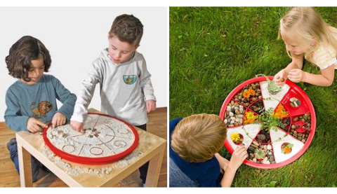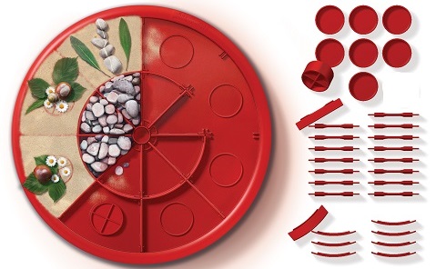 Форма для насыпных узоров — основа с высоким бортиком и вставками разнообразных форм — подходит для создания разнообразных художественных образов. Играть можно сидя за столом, на полу или на прогулке. Дети создают симметричные узоры, заполняя форму выбранным наполнителем, используя цилиндрические формы, прямые и дугообразные вставки.