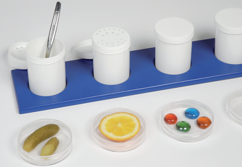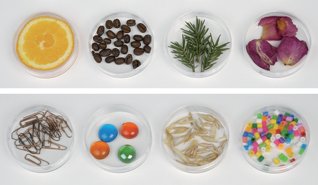 В пластмассовые непрозрачные стаканчики с двойной крышкой (наружной — отвинчивающейся, а внутренней — перфорированной), можно насыпать различные пахучие вещества. И их же засыпать в прозрачные чашечки с крышками.