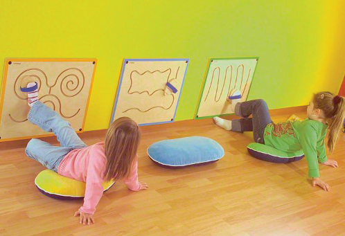 - Деревянные панели-лабиринты, предназначенные для движений ногами по сложным траекториям, располагаются на удобной высоте на стене. Ребенок надевает специальное «сабо» и проводит ногой от начала до конца извилистого желоба в форме волны, бабочки или горной гряды.