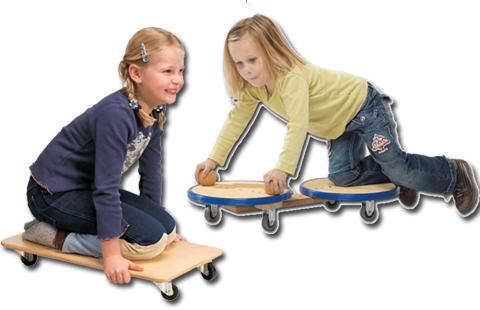 - Устойчивая деревянная Доска на четырех роликах, с поворачивающимися вокруг своей оси колесами, — годится для упражнений стоя и сидя. Ребенок может отталкиваться руками от пола или, сев на доску, отталкиваться от пола ногами.