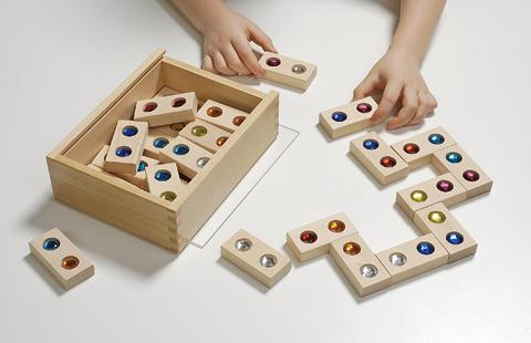 Сверкающее домино — набор полированных деревянных фишек, в каждую из которых вставлено по 2 цветных искусственных камешка — всего 7 цветов.