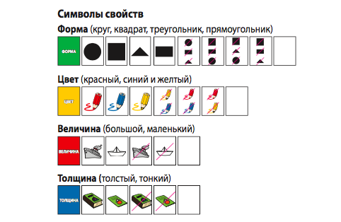 Знакомство детей с символами свойств является важным этапом в освоении всей знаковой культуры, языка математических символов, основ программирования, кодирования и декодирования информации. Альбом состоит из четырех комплектов карточек, собранных в блокноты, с условными изображениями одного из четырех признаков блоков Дьенеша — формы, цвета, величины и толщины.
