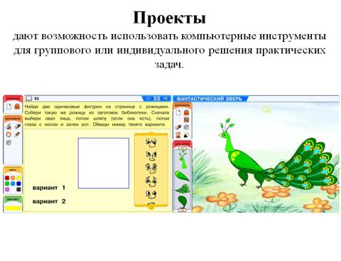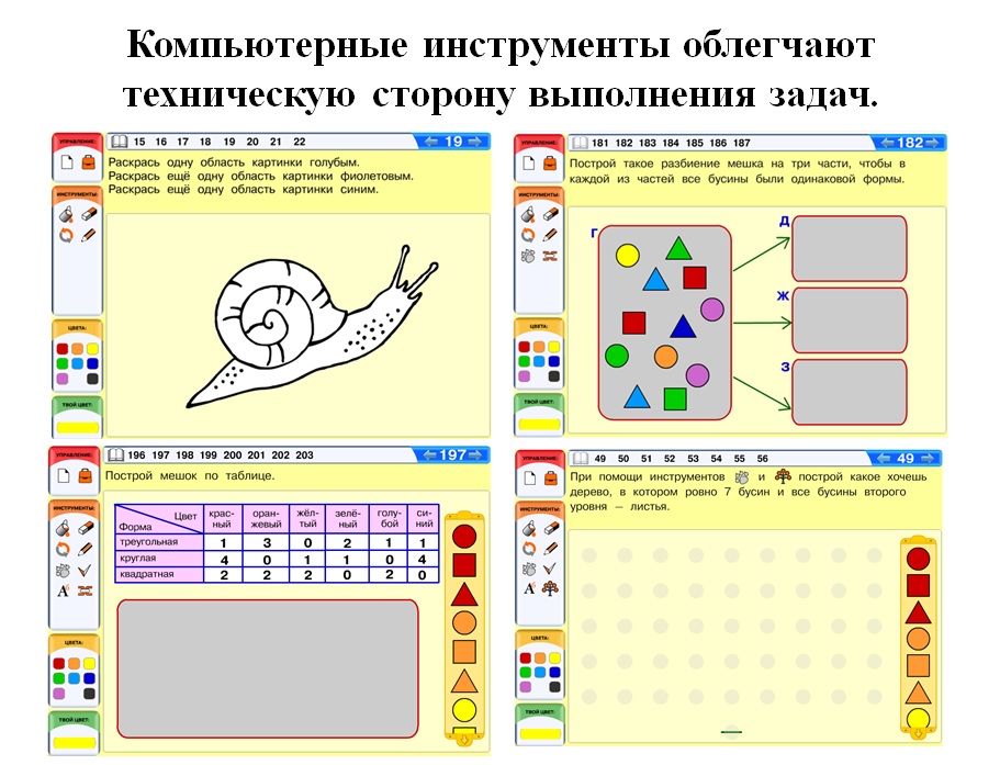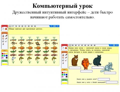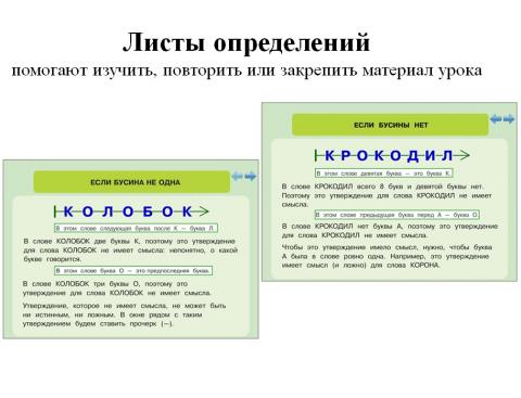 Компьютерный урок содержит необходимую теорию на листах определений, которые, так же как и задачи урока, озвучены, что важно для плохо читающих детей. Все компьютерные уроки имеют общий дизайн, поэтому дети быстро осваиваются с их устройством.