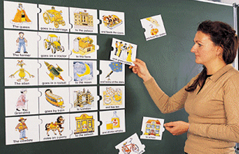 Игровое пособие для начинающих изучать грамматику английского языка. Нужно построить грамматически верное предложение, используя от двух до четырех элементов (напр. “Mr Green / goes by bus / to the supermarket / and buys four apples”). Пазловые соединения на каждой картинке помогут не ошибиться с порядком слов.