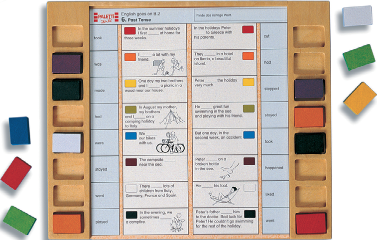 Для выполнения тренировочных упражнений на палитру — деревянную основу с углублениями — кладется карточка с заданиями, а возле ответов выкладываются фишки соответствующих цвета и формы. При проверке карточку переворачивают, кладут на палитру и затем проверяют, совпадают ли цвет фишек с раскраской по краям заданий. Карточки подбираются исходя из индивидуального плана занятий: Английский язык для начинающих и базовый уровень, Орфография немецкого языка для начинающих и базовый уровень.