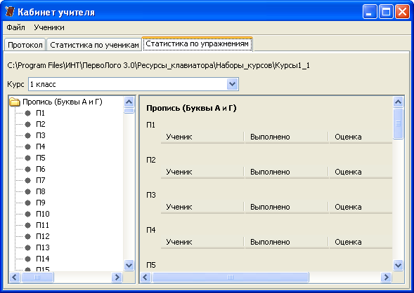 Кабинет учителя предоставляет возможность создавать на сервере школы специальную папку со списком классов и учеников, назначать курсы для каждого класса или ученика, просматривать протоколы работы учеников, получать и анализировать статистические сведения.