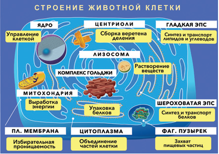 Хотя изображения частей клеток выполнены не в масштабе, это не мешает созданию у школьников целостного представления о строении животной и растительной клетки. Названия тех частей клетки, которые уже изображены на плакате, помещают в предназначенные для них рамки с указателями. Все остальные карточки с надписями располагают на плакате свободно, составляя при этом «тройки»: изображение органоида, его название и функция.