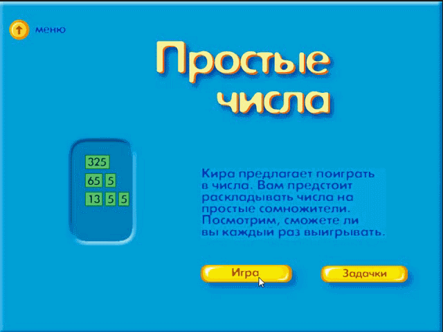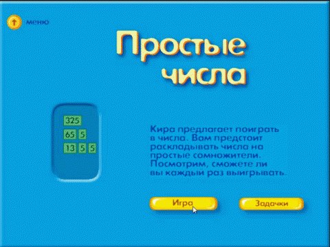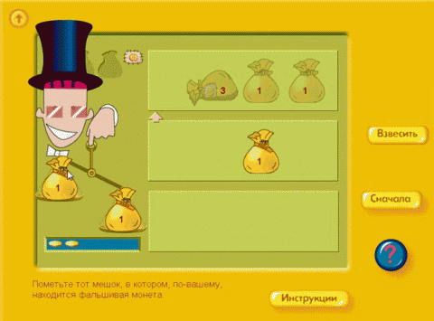 15 математических игр для школьников 5—7-х классов, в каждой из которых ребенок сначала получает экранную модель выбранной игры (крестики-нолики, различные карточки, сосуды для задач на переливание, кораблики для задач на движение, монеты для взвешивания и т.п.), а потом набор задач для тестирования по данной теме.