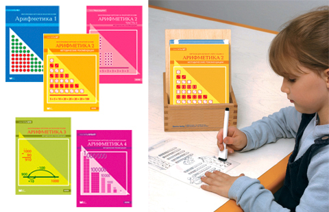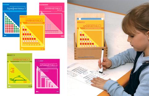 Пять наборов карточек серий «От 1 до 20\100\Таблица умножения\1000\1000000». Карточки с заданием вкладываются в планшет под прозрачную пленку. Ребенок записывает ответы к примерам на пленке с помощью «волшебного» фломастера. Перевернув карточку и вложив ее обратно в планшет, можно сравнить полученный результат с верным ответом, приведенным на обратной стороне карточки.
