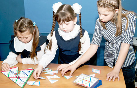 Набор пластиковых карточек в виде равносторонних треугольников для тренировочных упражнений индивидуально или в группах. Чтобы собрать все карточки в большой треугольник («пирамиду»), нужно решить примеры на сложение (или вычитание, умножение, деление). Правило сборки простое: к примеру прикладывается ответ того же цвета. Если треугольники сложены правильно, то внутри большого треугольника образуются круги одного цвета.