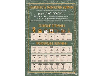 Плакат «Размерность физических величин» представляет около 30 основных и производных размерностей физических величин, характеризующих массы, расстояния, движения, силы, а также оптические, электрические и магнитные свойства.