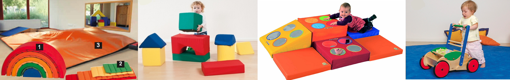 Конструктор из пенополиуретановых блоков — набор из 9 блоков, изготовленных из мягкого и гибкого пенополиуретана (в тканевых чехлах ярких цветов на молнии!) в форме прямоугольной арки, половины цилиндра, треугольной пирамиды, цилиндра, прямоугольного параллелепипеда и куба. В процессе игры нужно перетаскивать блоки, ставить их друг на друга, строить простейшие конструкции — и при этом тренироваться. Можно последовательно наращивать высоту, ставя блоки друг на друга, и попытаться побороть страх перед спрыгиванием.