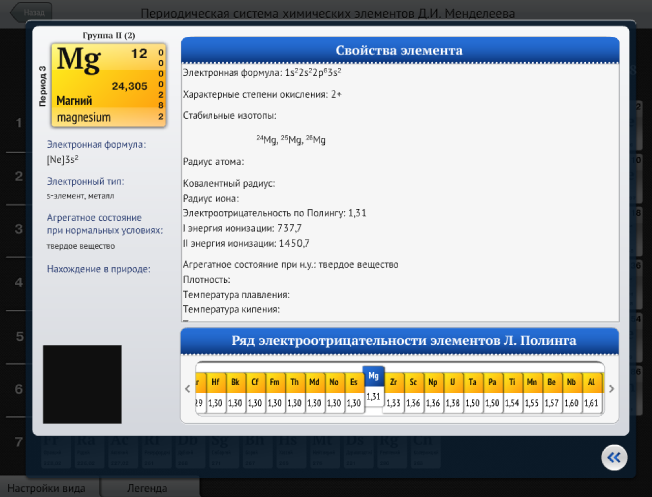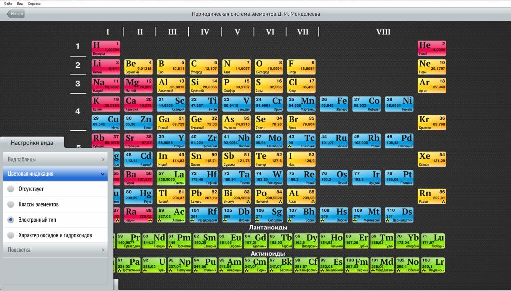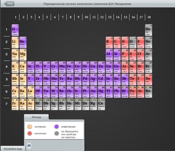 Периодическая система элементов реализована в интерактивном формате и отображает Периодическую систему химических элементов в традиционном для школы короткопериодном и принятом Международным союзом теоретической и прикладной химии (IUPAC) длиннопериодном виде.