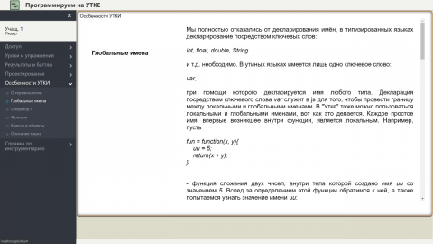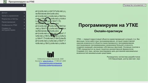 УТКА — первый подростковый объектно-ориентированный «утиный» (т. е. без фиксации типов имён) язык программирования, имеющий минимальный арсенал встроенных инструментов, достаточный для создания проектов на разные темы (в том числе анимаций), использующий такие понятия как объекты, классы, конструкторы, коллекции. Веб-практикум, созданный на основе этого языка, содержит последовательность заданий возрастающей сложности и теоретические сведения к ним, а также примеры проектов.
