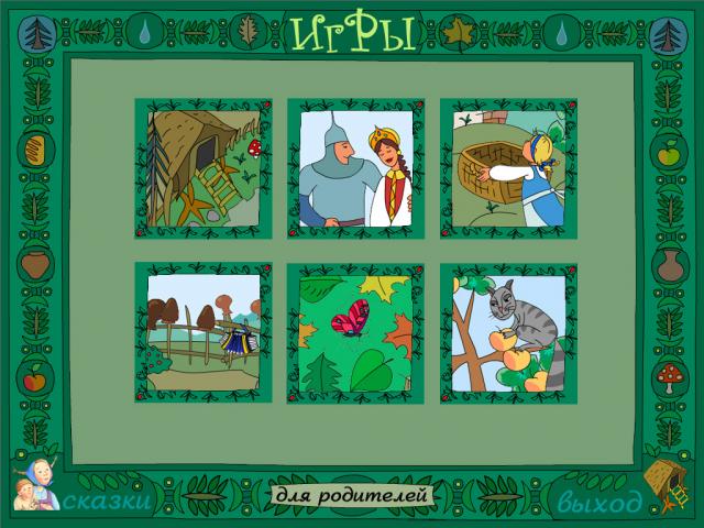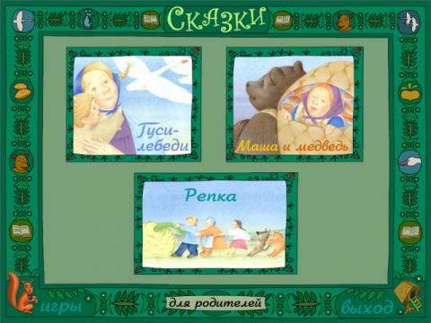 Мультимедийный продукт, состоящий из электронной книги с русскими народными сказками и раздела игр по сюжетам сказок. Раздел игр содержит шесть «сказочных» игр, способствующих развитию памяти, внимания, быстроты реакции, логического мышления и музыкального слуха.