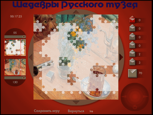 Программа представляет собой электронную версию популярной настольной игры. Игрокам предлагается собрать из пазлов изображения картин, оригиналы которых входят в коллекцию шедевров Русского музея: К. Брюллов «Последний день Помпеи», И. Репин «Запорожцы», К. Беггров «Михайловский дворец», И. Шишкин «Корабельная роща», Ф. Журавлев «Перед венцом», Б. Кустодиев «Купчиха за чаем», К. Петров-Водкин «Утренний натюрморт» и И. Машков «Натюрморт с веером».