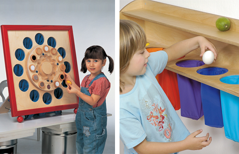 - Наборы деталей из материалов разной жёсткости, парные элементы, совпадающие по весу и жёсткости, — для занятий и дидактических игр на узнавание и запоминание предметов по их весу и жёсткости.