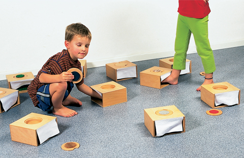 - Мешочки, коробки и ящички с фигурками различной формы или с рельефными изображениями — для выполнения заданий на различение, опознавание и запоминание предметов на ощупь по их форме.