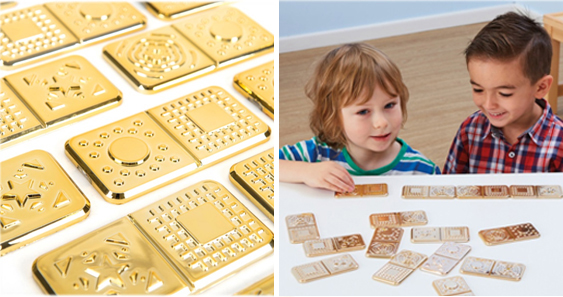 - Тактильные пирамиды и домино — помимо классической игры в домино можно использовать для ощупывания поверхностей на пластинах, поиска одинаковых рисунков визуально или «вслепую», для свободных творческих игр в качестве конструктора, «сокровищ» или других предметов-заместителей.