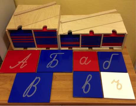 Алфавит печатный. 33 пластины из МДФ размером 11х14 см с изображениями печатных букв русского алфавита, выполненных песком. Доски окрашены в три цвета (согласные, гласные, мягкий и твердый знаки).