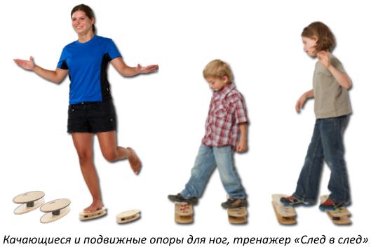 Качающиеся и подвижные опоры для ног и качающиеся тренажеры позволяют тренироваться, стоя как на обеих, так и на одной ноге, и выполнять упражнения для стабилизации осей ног, мобилизации голеностопных сочленений, координации движений, чувства равновесия и повышения скорости реакции. Способствуют улучшению взаимодействия между нервной системой и двигательной мускулатурой.