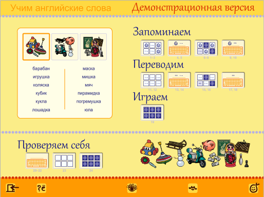 Тренажёр учит английским словам с помощью картинок, диктантов и заданий на перевод. В каждом задании неправильно определённые слова отрабатываются дополнительно, а наглядная сводка результатов позволяет отследить успехи в изучении новых слов. Доступен интерактивный словарик, также содержащий аудиозаписи всех слов с картинками.