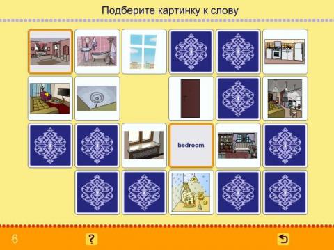 Проверка качества полученных знаний осуществляется в форме известной игры «Memory». Все карточки располагаются рубашками вверх, необходимо открывать карточки попарно и находить правильные сочетания. Игра не только способствует долговременному запоминанию иностранных слов, но и позволяет развивать зрительную и оперативную память ребенка.