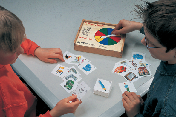 • В комплект игры входит вращающийся диск («spinner») с четырьмя секторами и карточки с иллюстрациями (уменьшенные карточки к магнитным плакатам), которые надо разложить в 4 стопки (по темам) картинкой вверх. Затем вращают «spinner». Тот, кто правильно назовет по-английски изображение на верхней карточке в стопке, против которой остановился «spinner», забирает эту карточку.