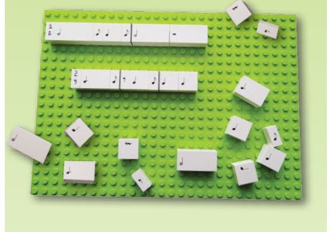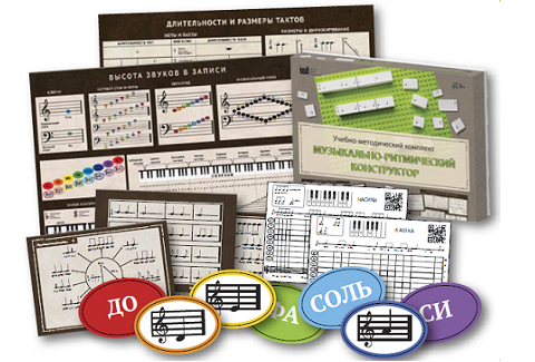 - конструктор, в который входят кубики пластиковые разных размеров с нотными знаками (и без них), плата для составления ритмических примеров из кубиков, тактовые разделители, аксессуары;