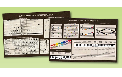 - демонстрационные плакаты «Высота звуков в записи», «Длительности и размеры тактов» (виниловые, рулонные, в тубусе);