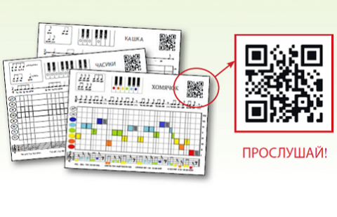 - карточки-таблицы с песенками и QR-кодами для прослушивания записи звучания музыкального фрагмента (на телефоне, планшете, компьютере), предназначенные для самостоятельной итоговой работы детей с музыкально-ритмическими примерами;