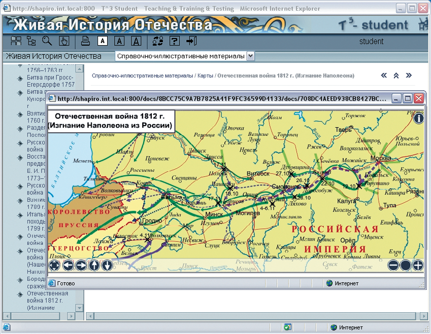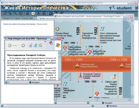 Информационная система по истории России с древнейших времен до начала ХХ века включает в себя учебные тексты, фрагменты источников и научной литературы, биографические справки об исторических деятелях, толкование терминов и понятий в историческом словаре, материалы исторической хронологии и генеалогии.